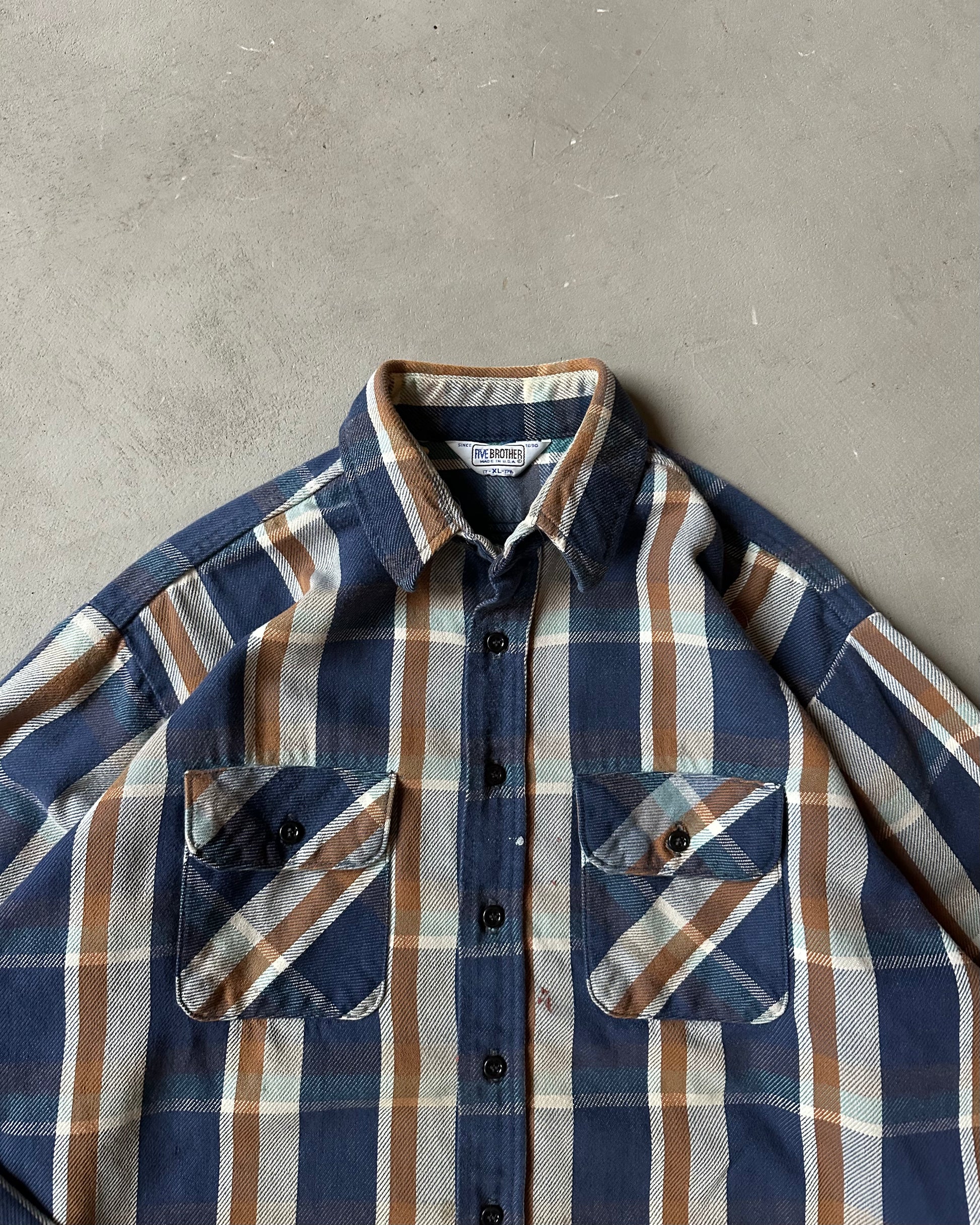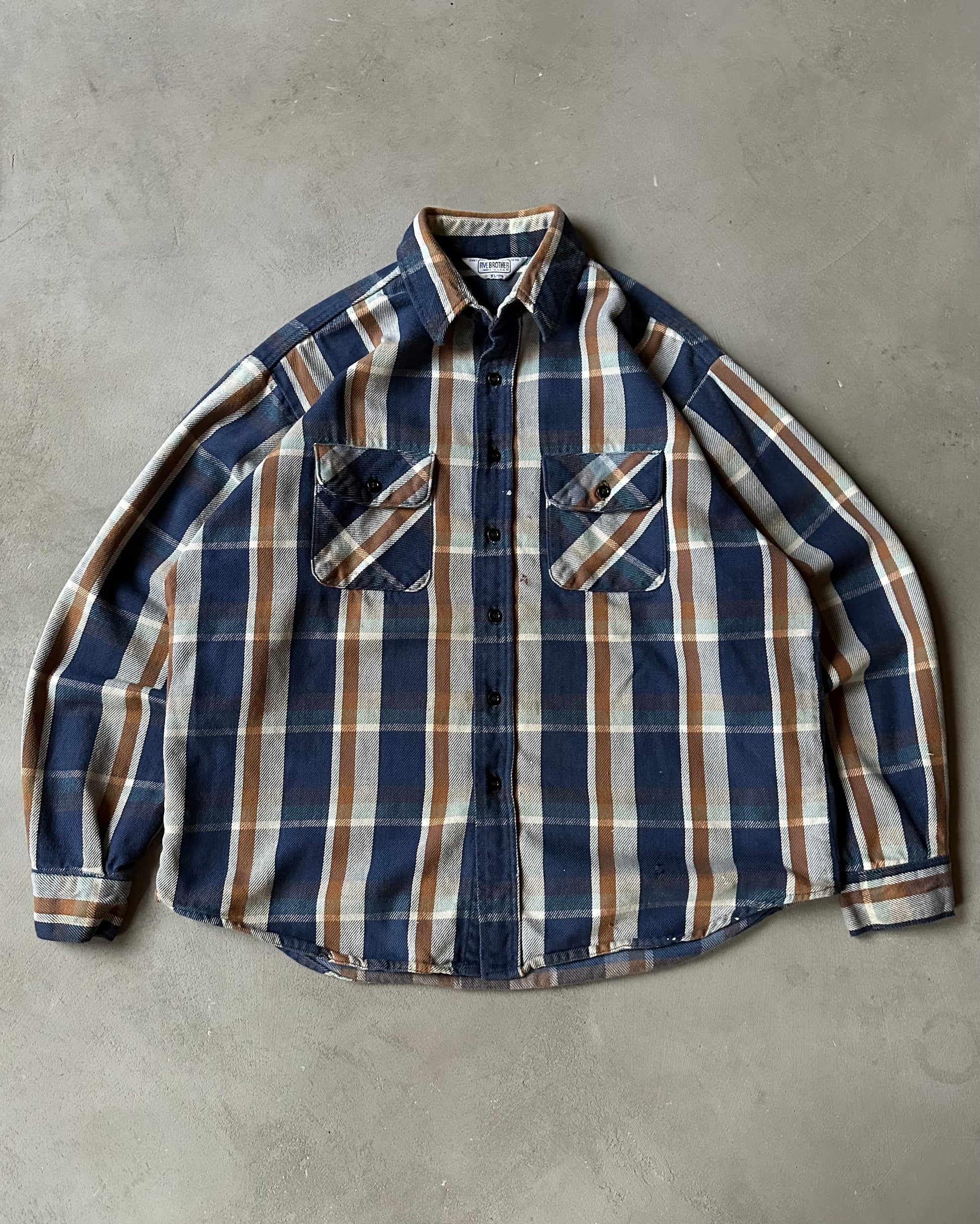 1980s - Distressed Navy/Brown Five Brother Plaid Flannel - L